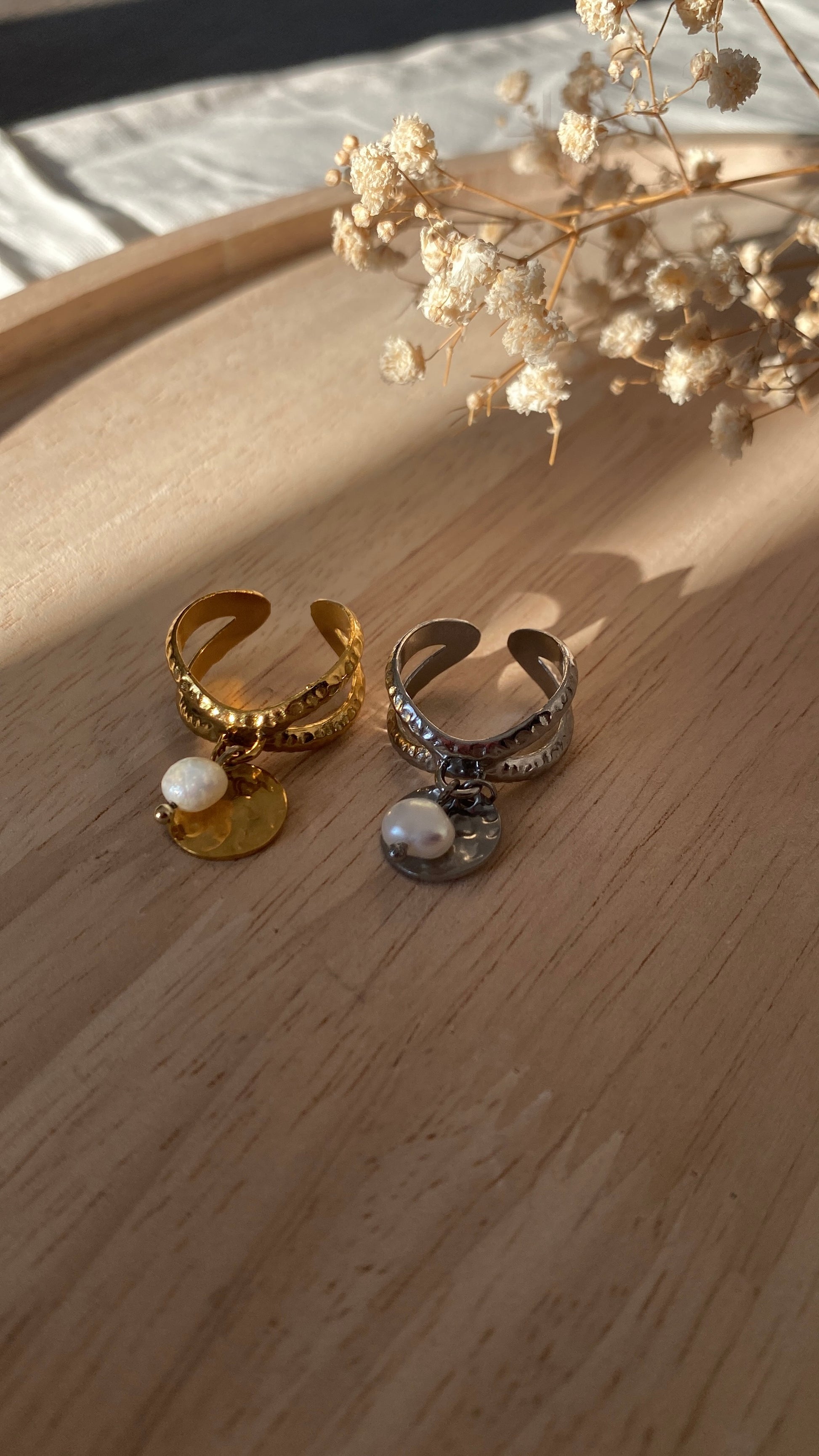 Bague breloques « croisée » argentée, réglable et en acier inoxydable.