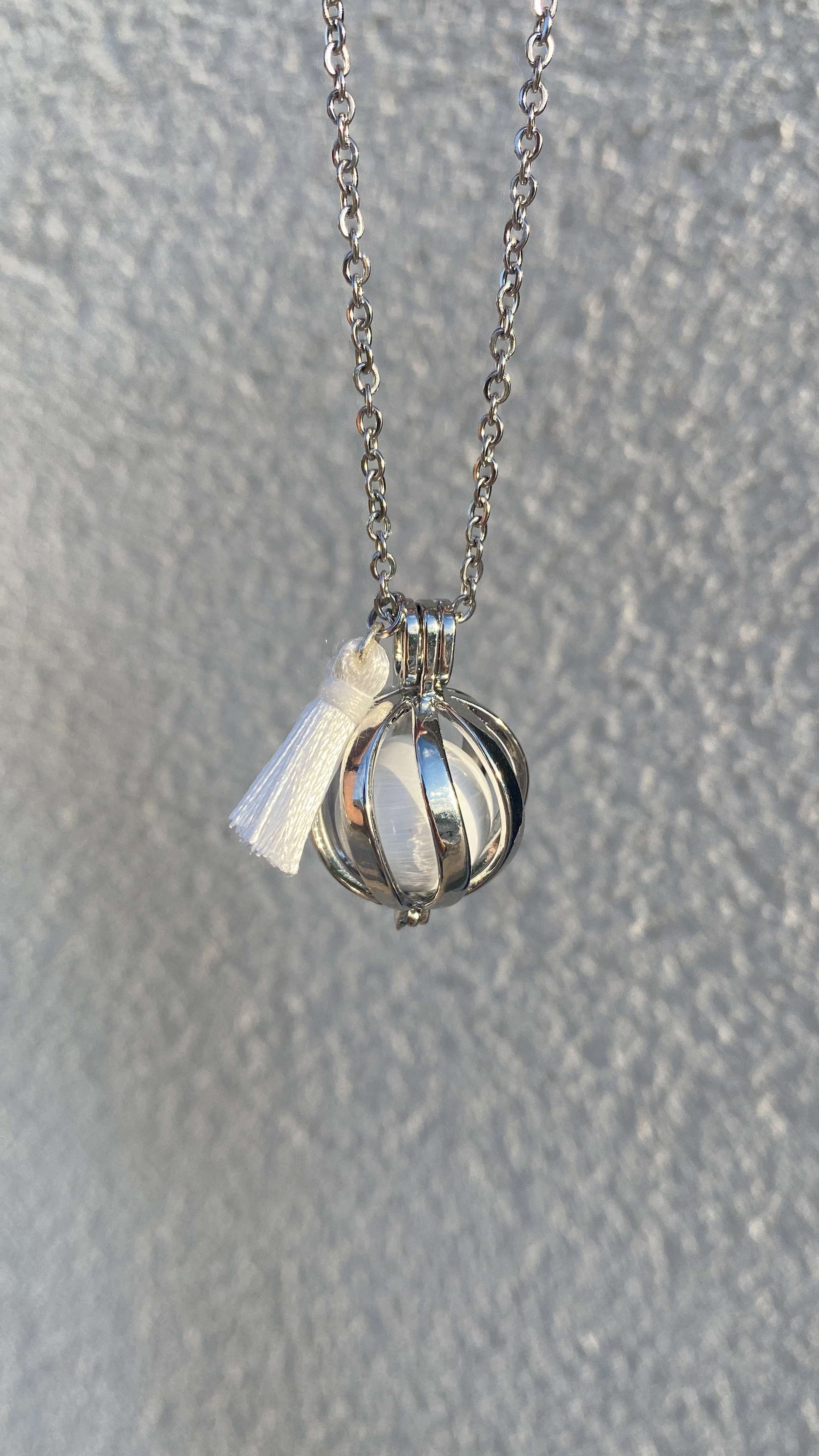 Bola de grosses argenté en acier inoxydable avec perle blanche et pompon.