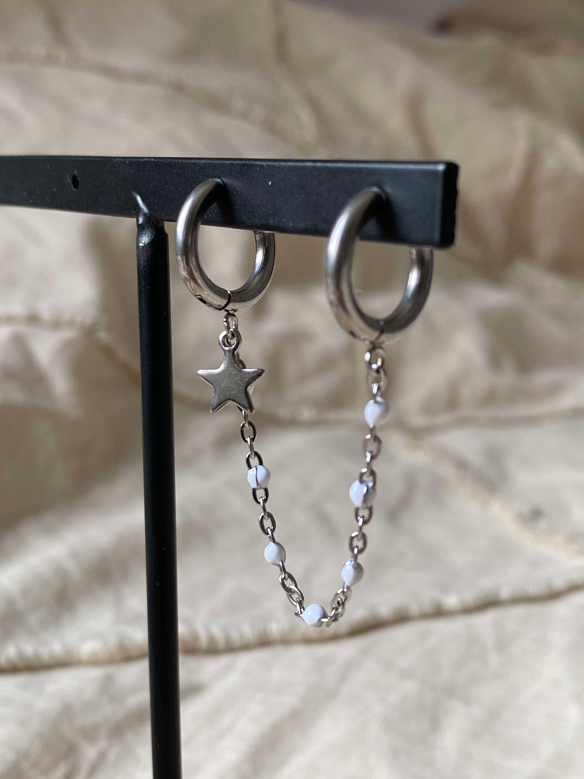 Boucle d'oreille double argentée chaîne émaillée blanche, et étoile. En acier inoxydable