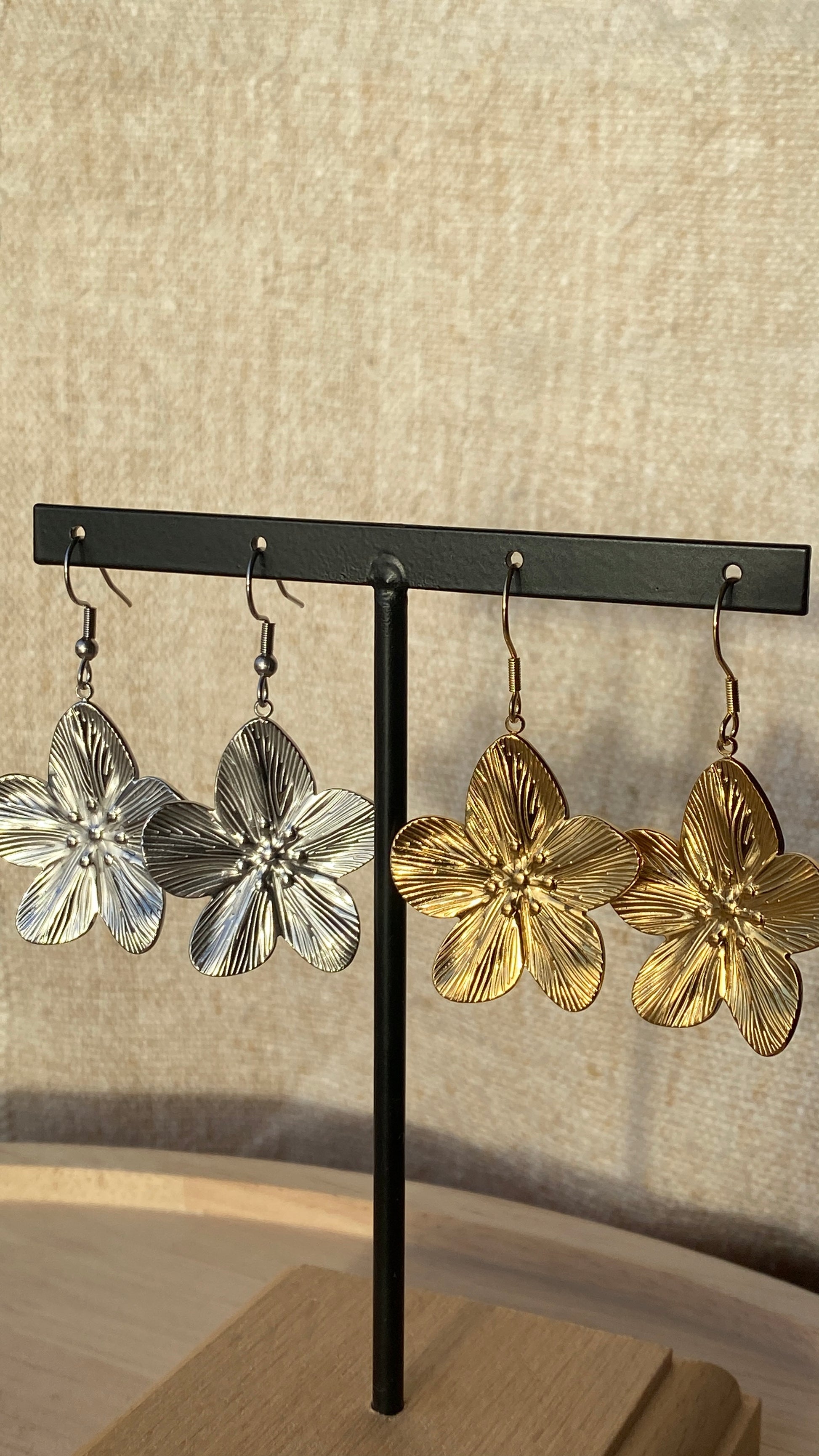 Paires de boucles d’oreilles fleurs en doré ou argenté en acier inoxydable.