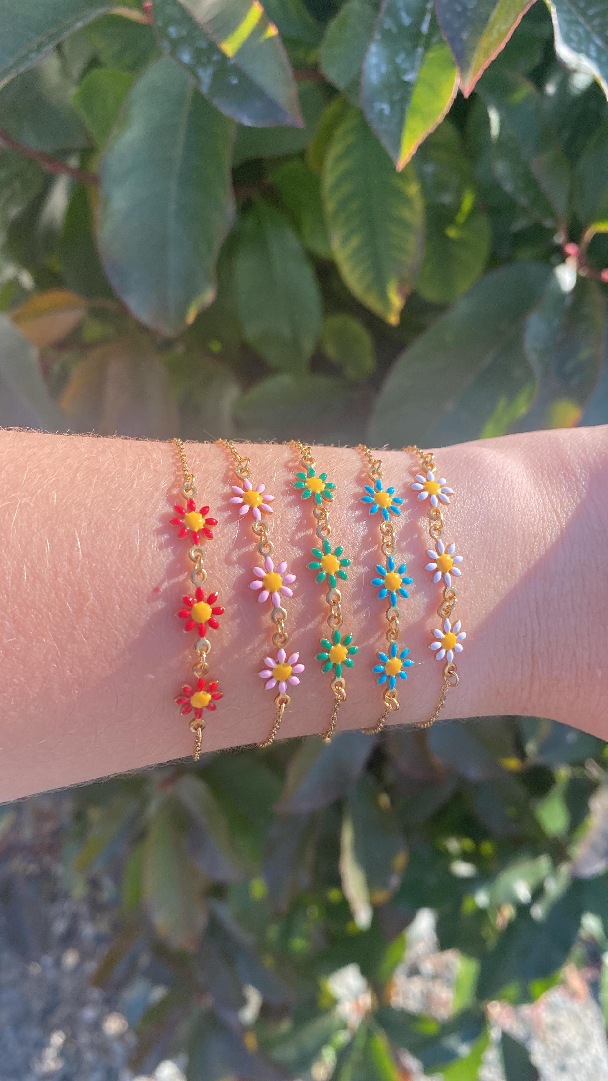 Bracelets dorés en acier inoxydable, avec fleurs émaillées (rouge, rose, bleu, vert, blanc). Les bracelets mesurent environ 16cm (sans compter la petite chaînette d'extension).