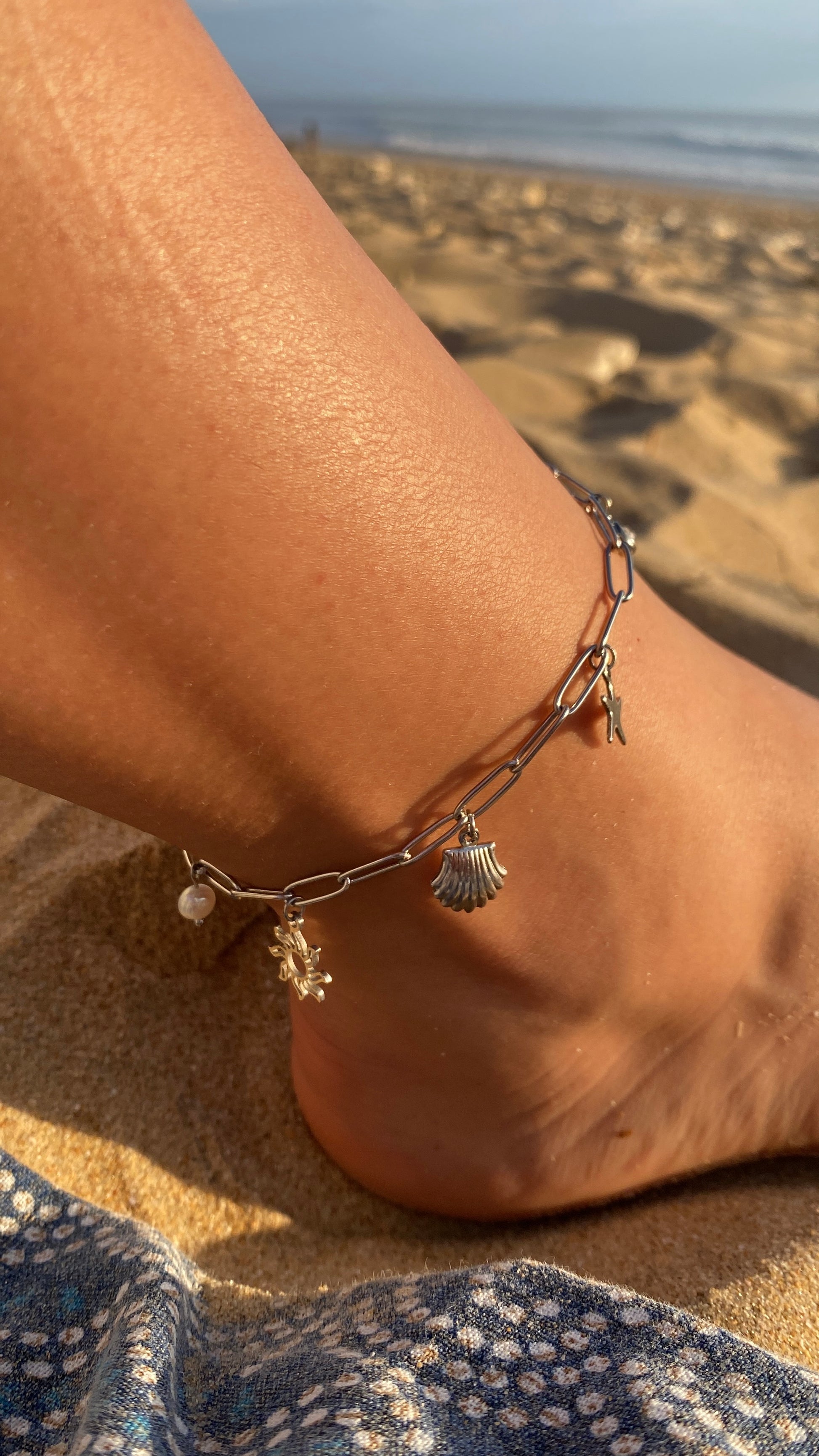 Chevillère a breloques : strass, Etoile de mer, coquillage, soleil, perlé d’eau douce. Réglable et en acier inoxydable