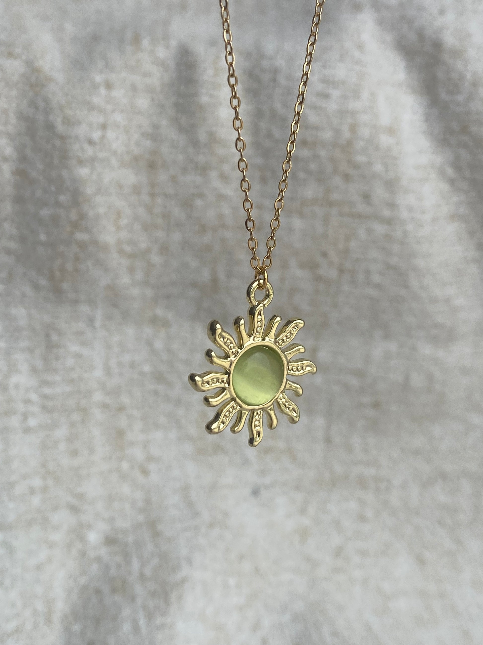 Collier doré, soleil vert. Plaqué or et acier inoxydable.