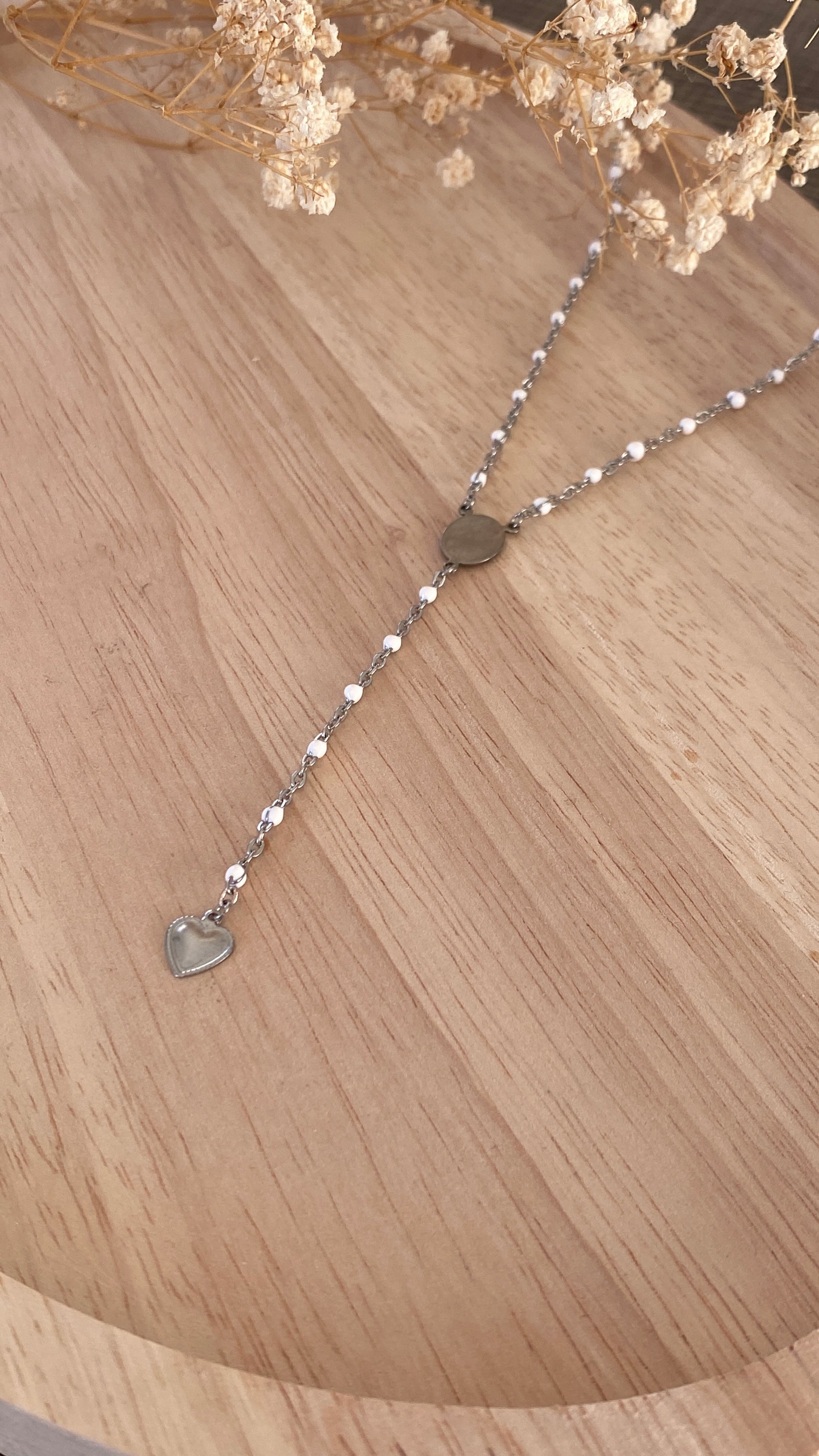 Collier Y, argenté émaillé blanc, petit cœur, en acier inoxydable.