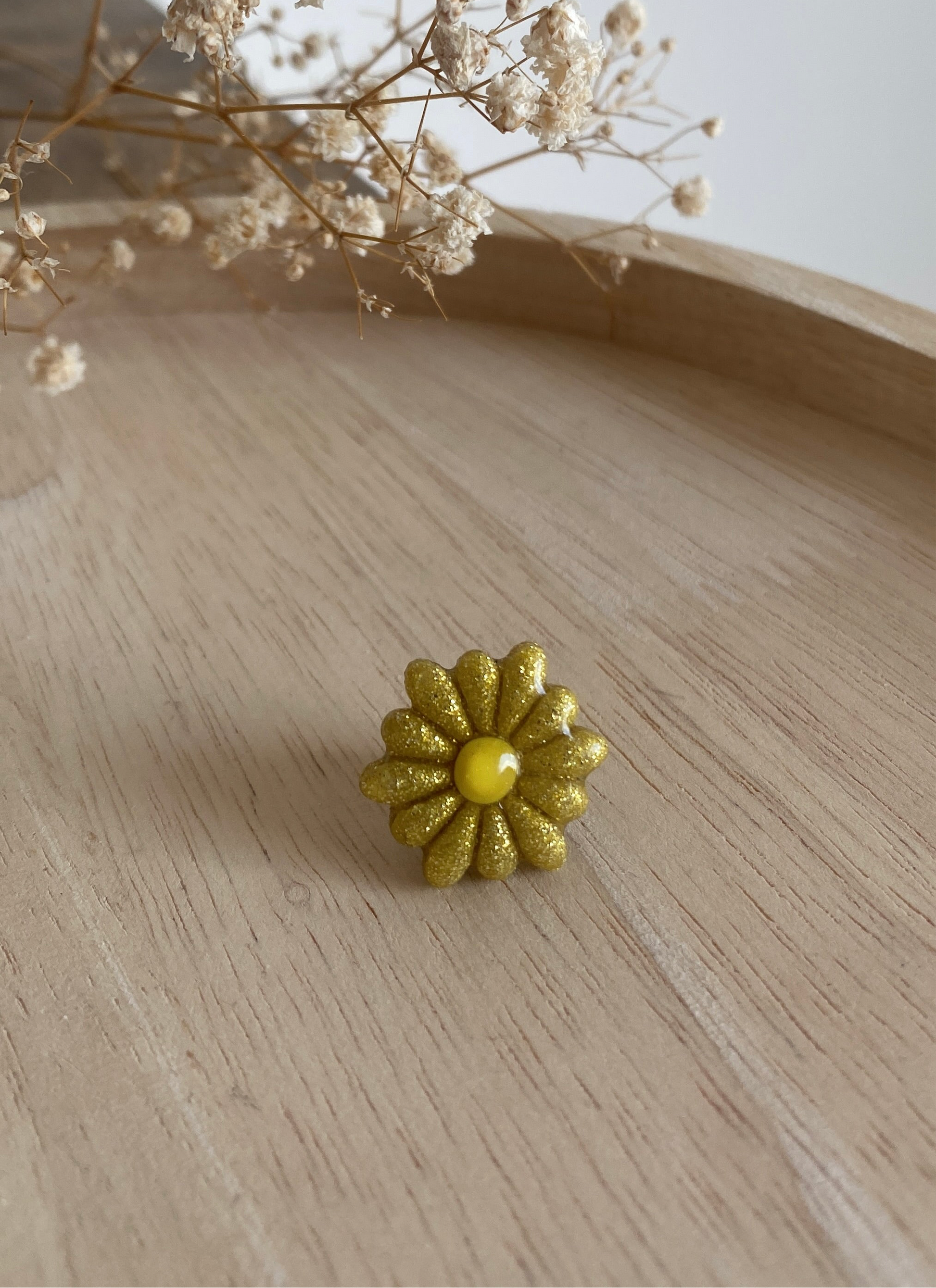 Pin’s fleur dorée, réalisé à la main en pâte polymère et protégé par de la résine.