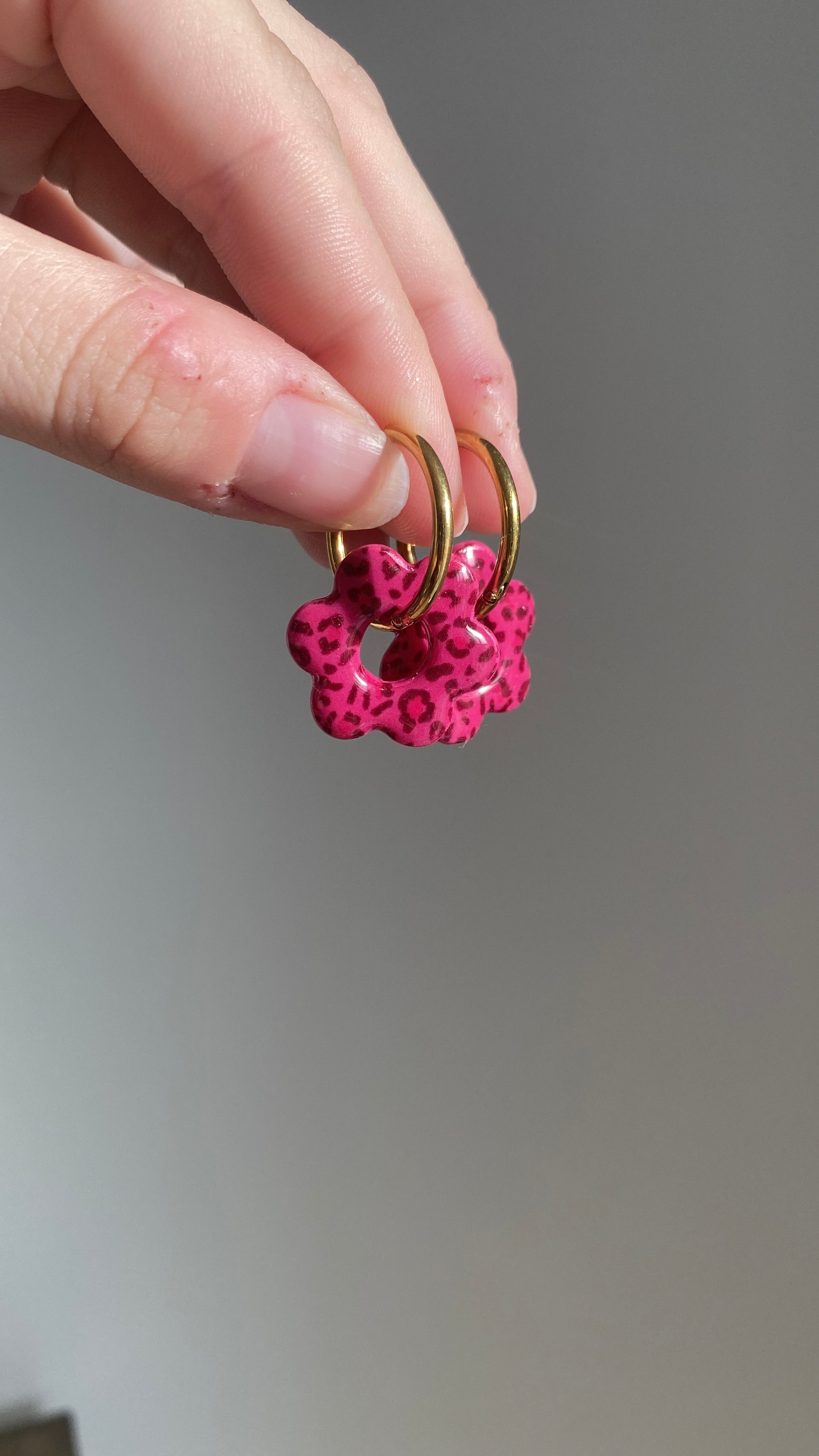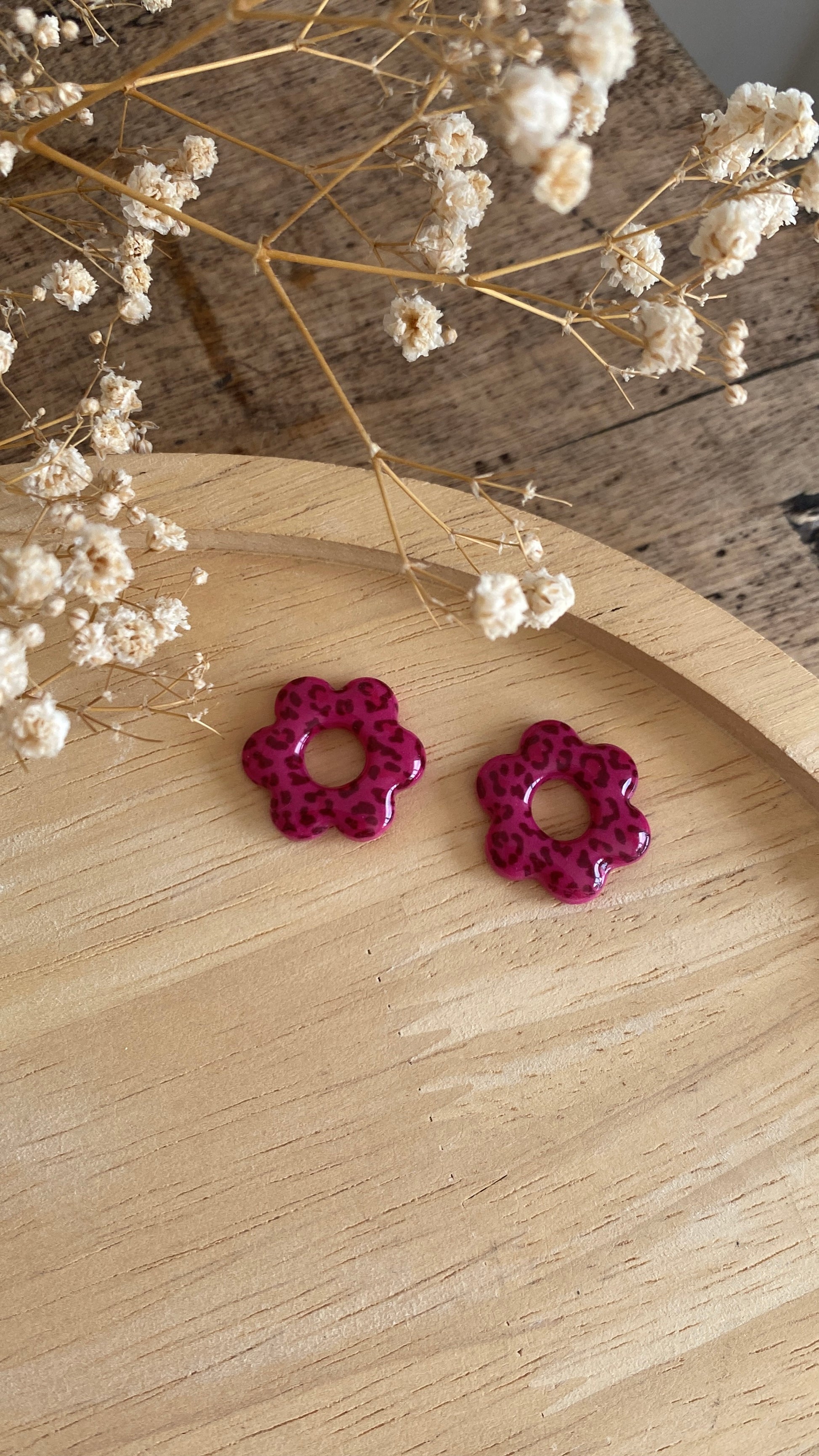 Paire de Pampilles fleurs léopards roses. Réalisées à la main en pâte polymère, et protégées par de la résine.