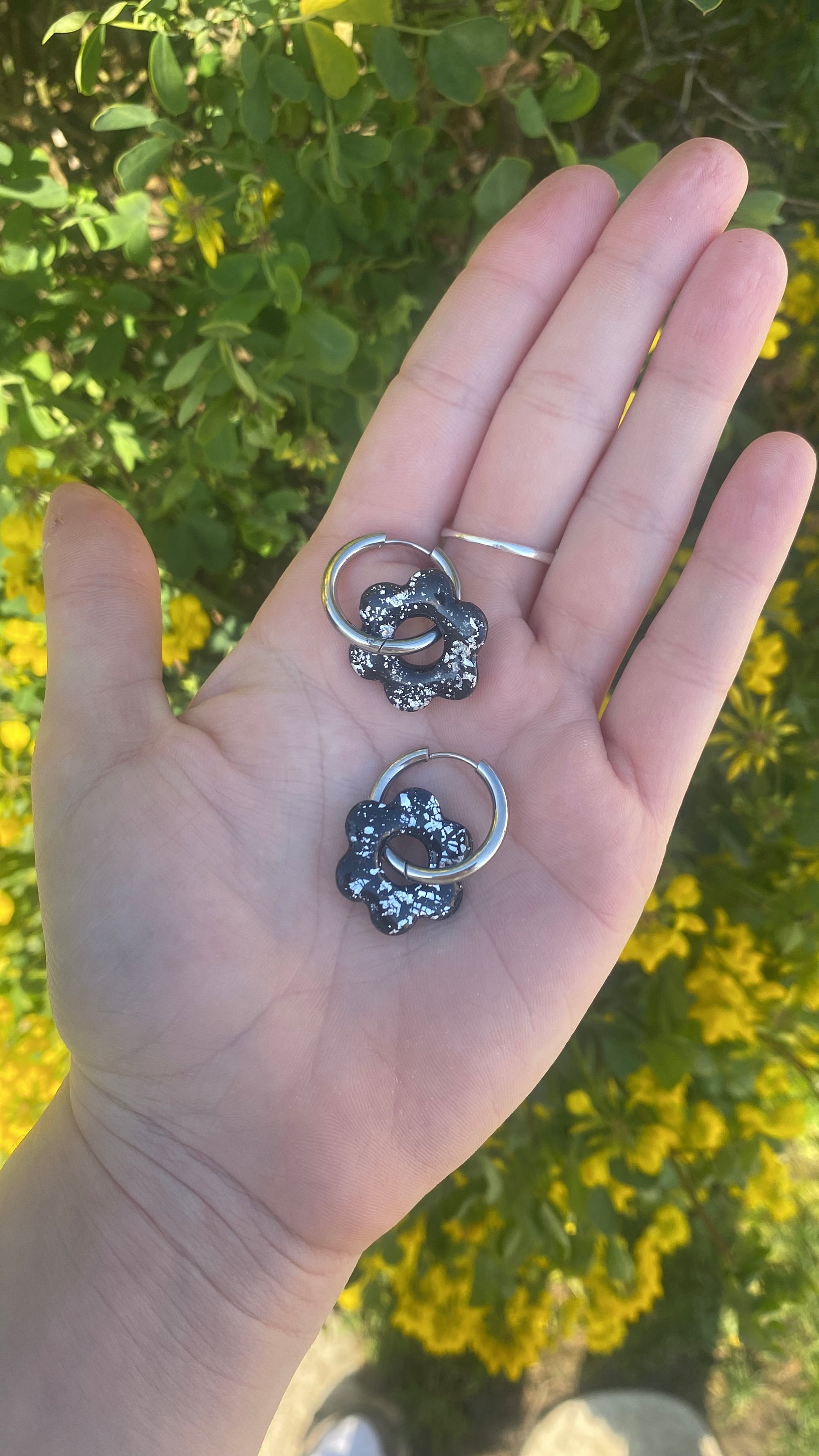 Paire de Pampilles fleurs, noires et feuilles d’argent.