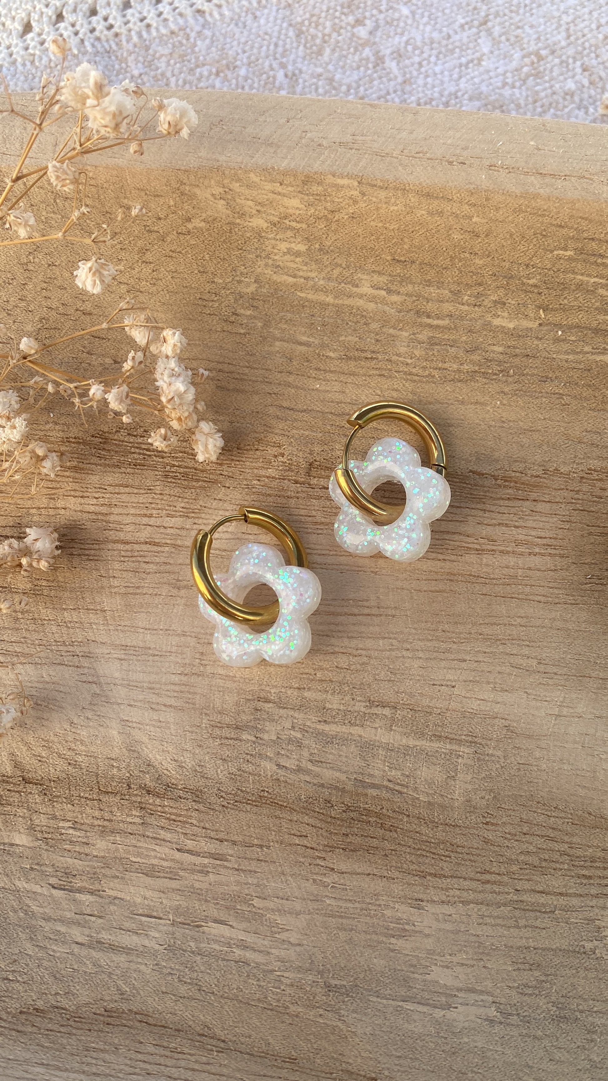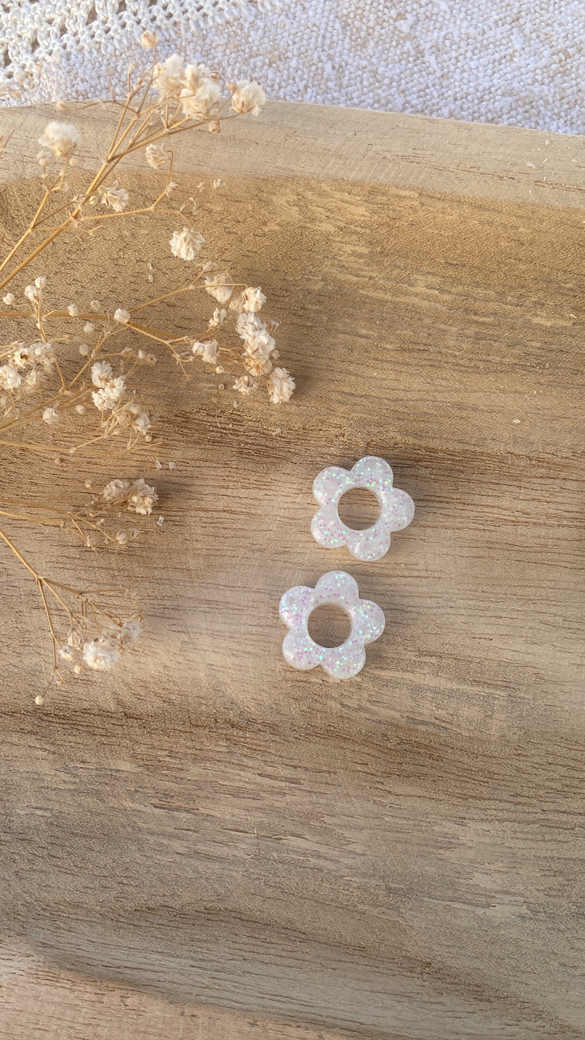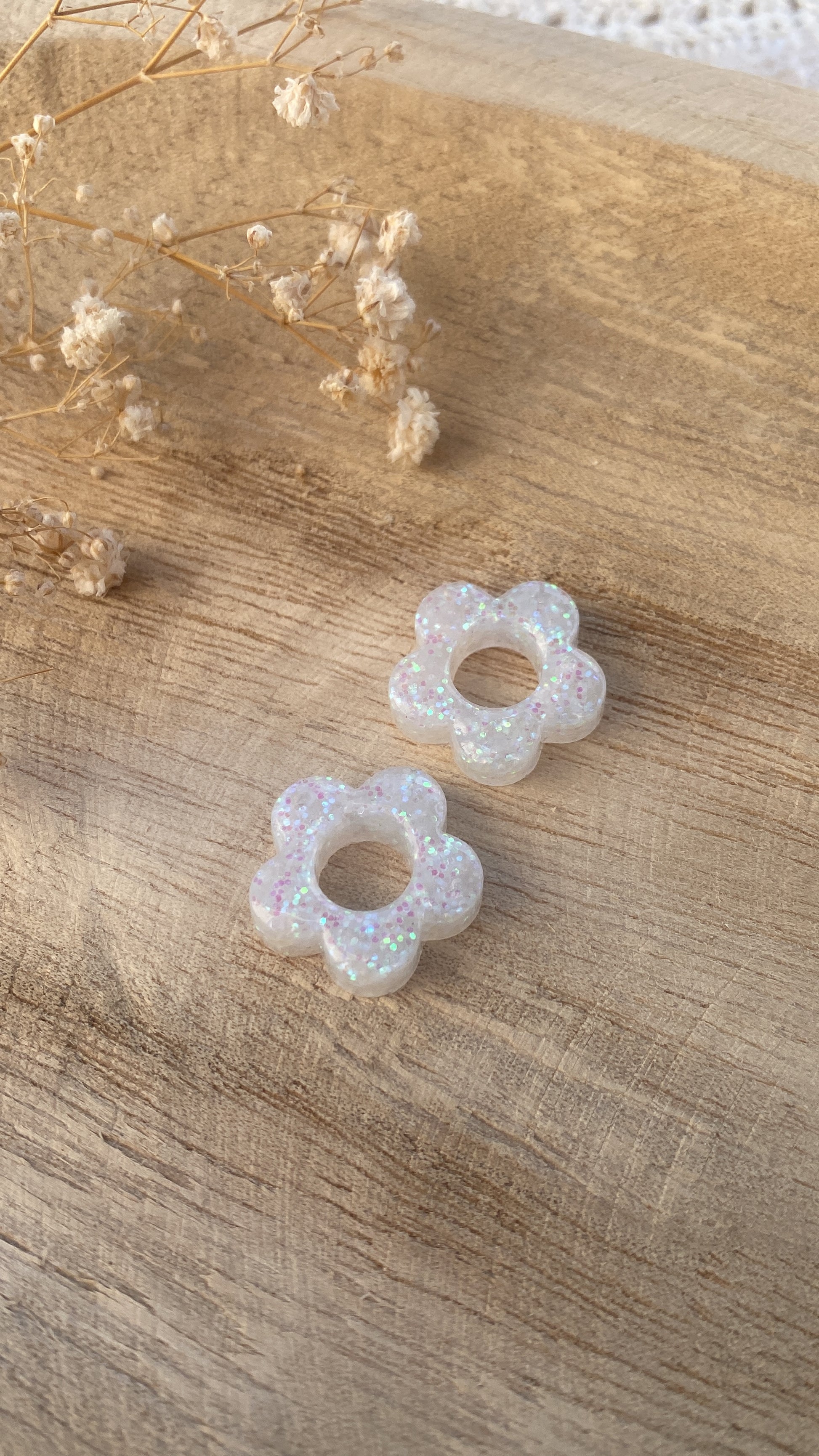 Paire de pampilles à paillettes blancées, légèrement irisées, pour boucles d'oreilles interchangeables. Réalisée à la main, en résine.