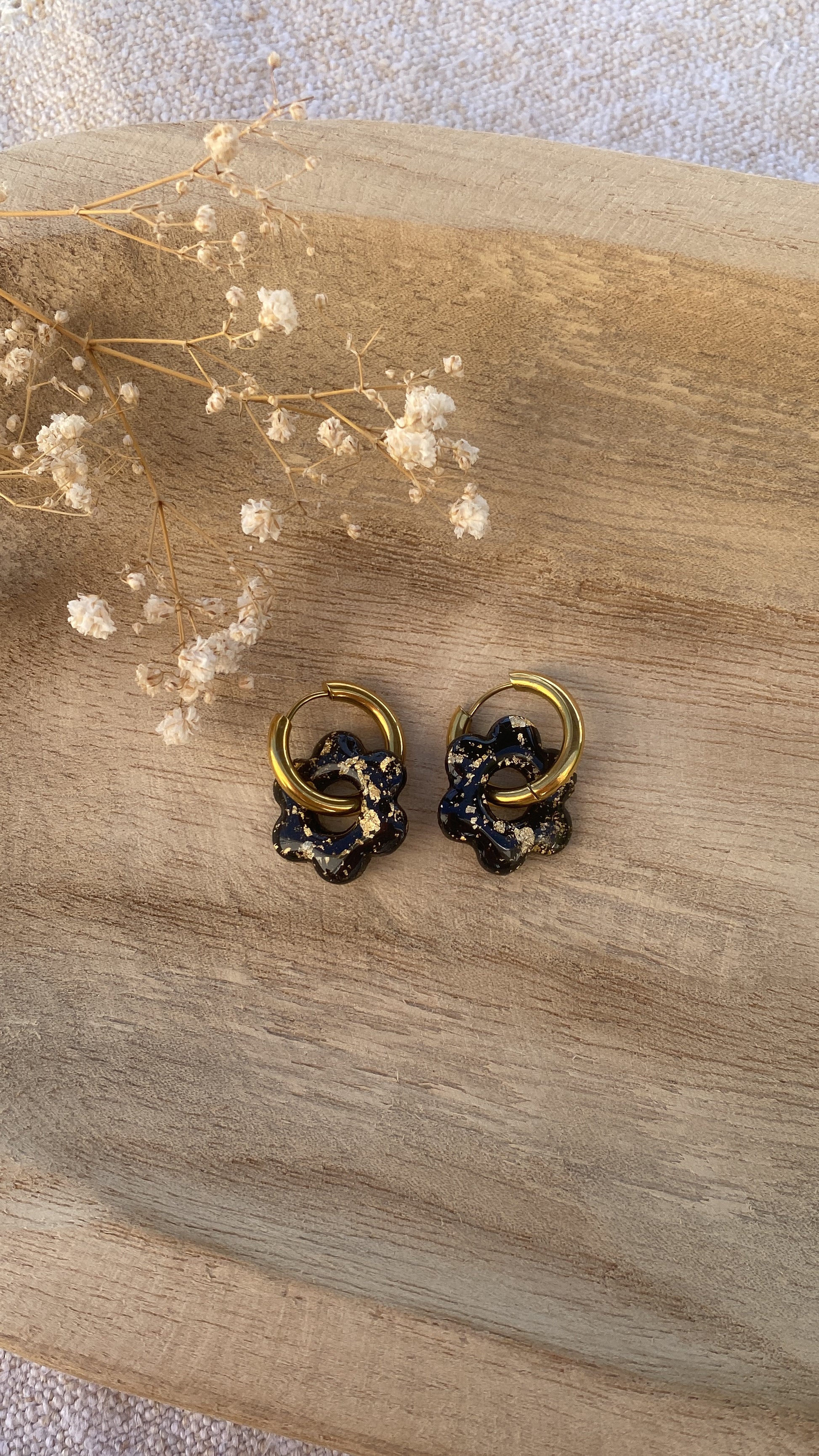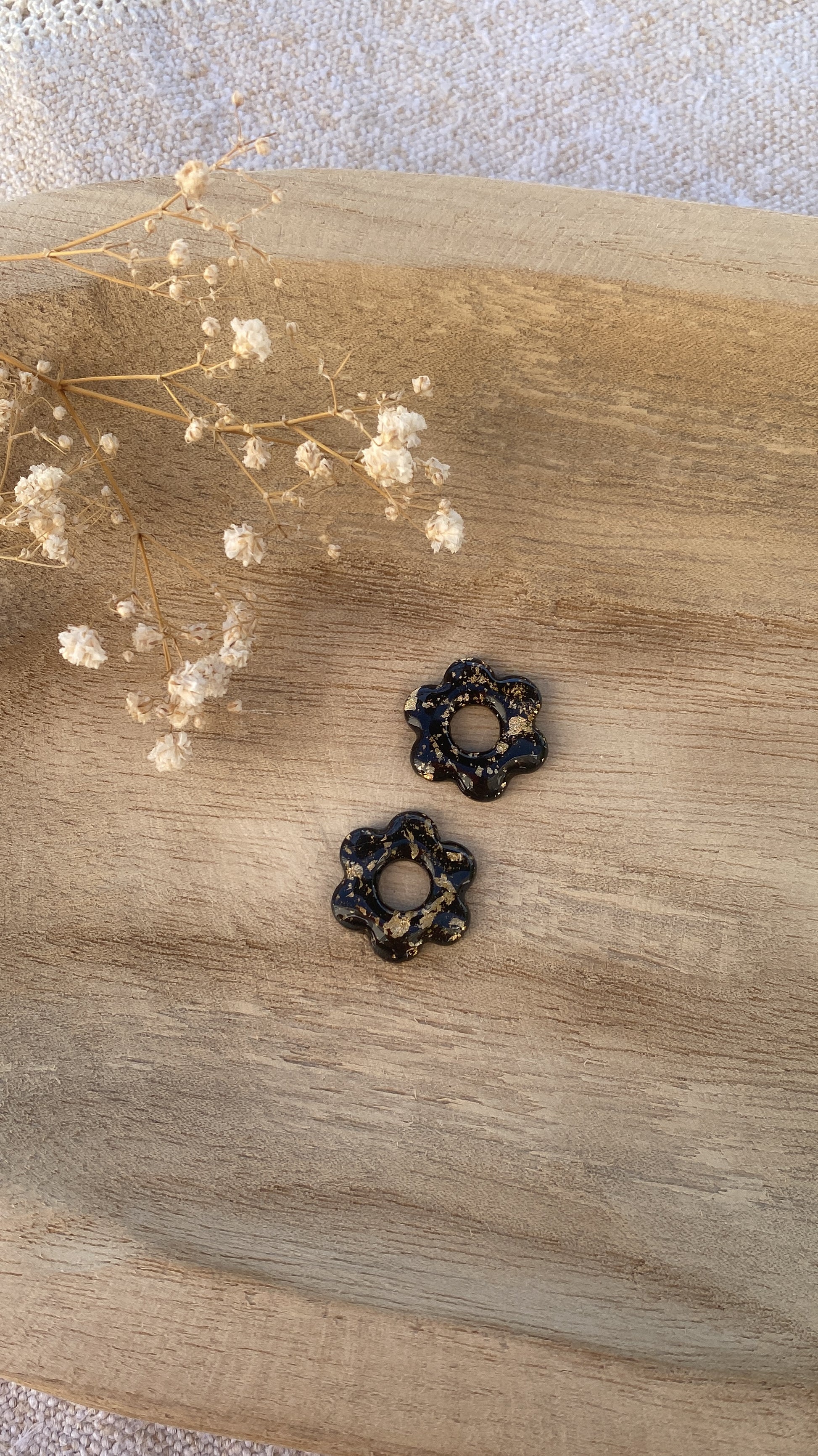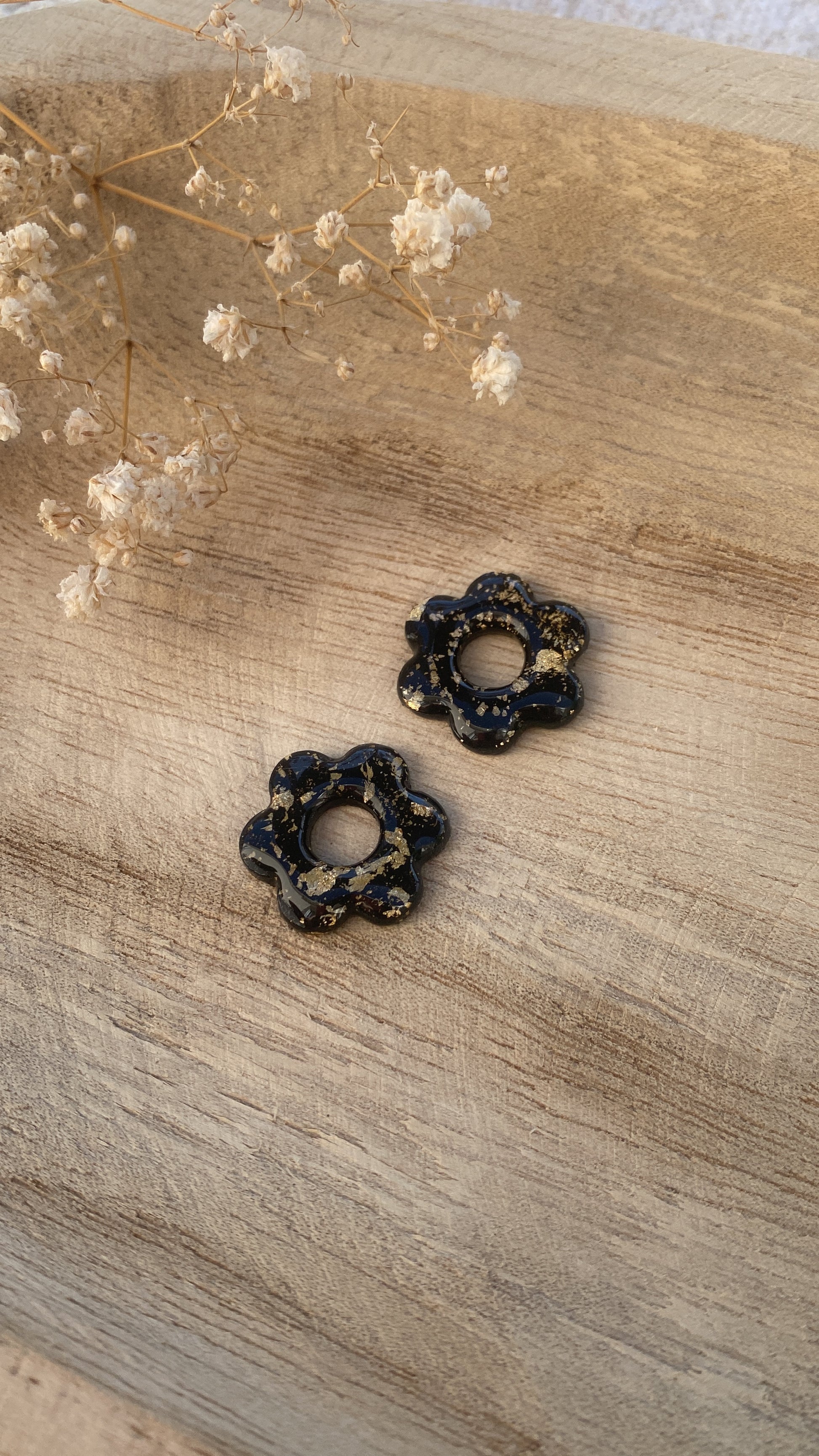 Paire de pampilles interchangeables, fleurs noires et dorées. Réalisées à la main avec de la pâte polymère, de la feuille d’or et vernie par de la résine.