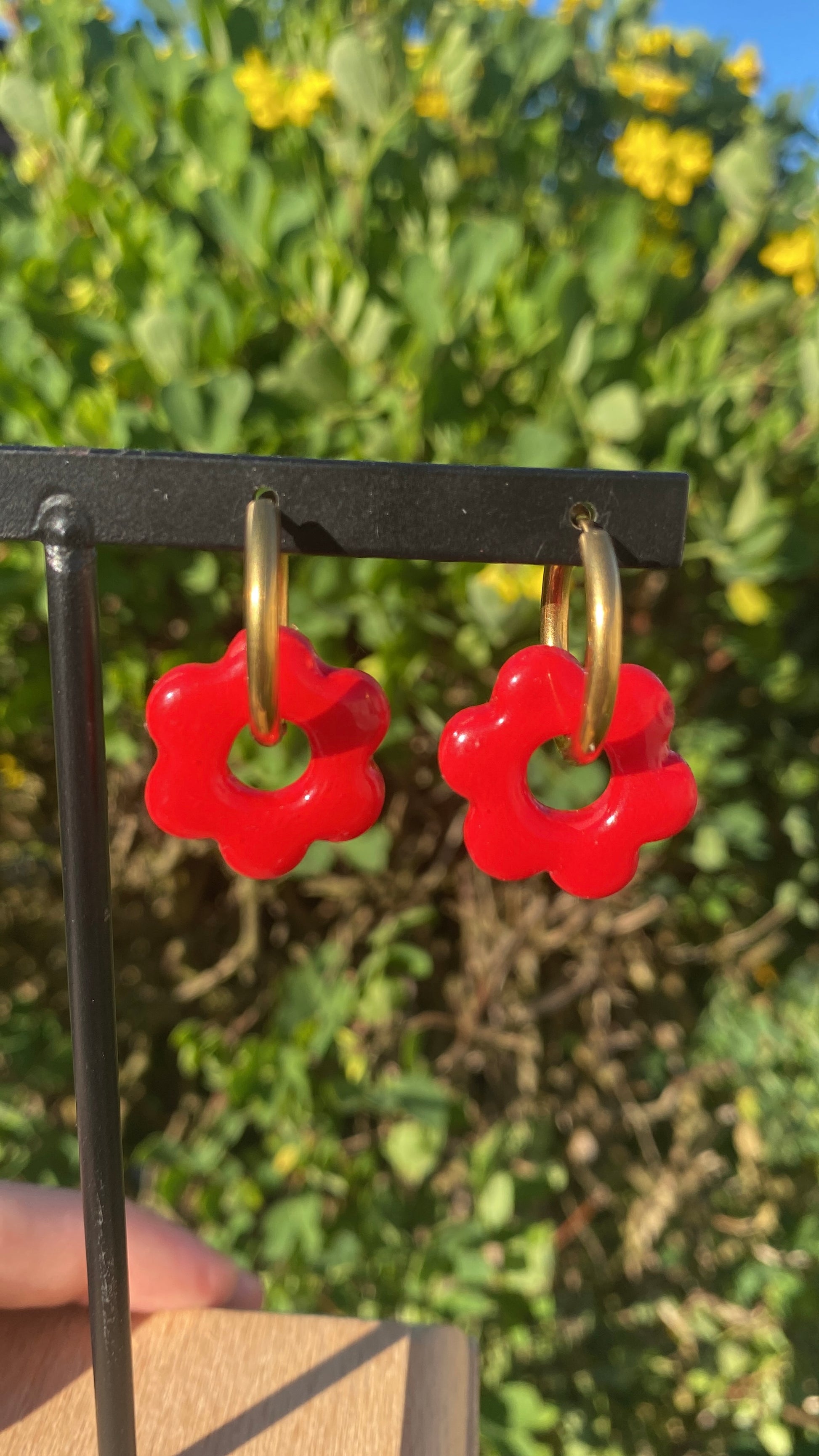 Paire de pampilles fleurs rouges, pour boucles d'oreilles interchangeables. Réalisée à la main en pâte polymère et protégée par de la résine.