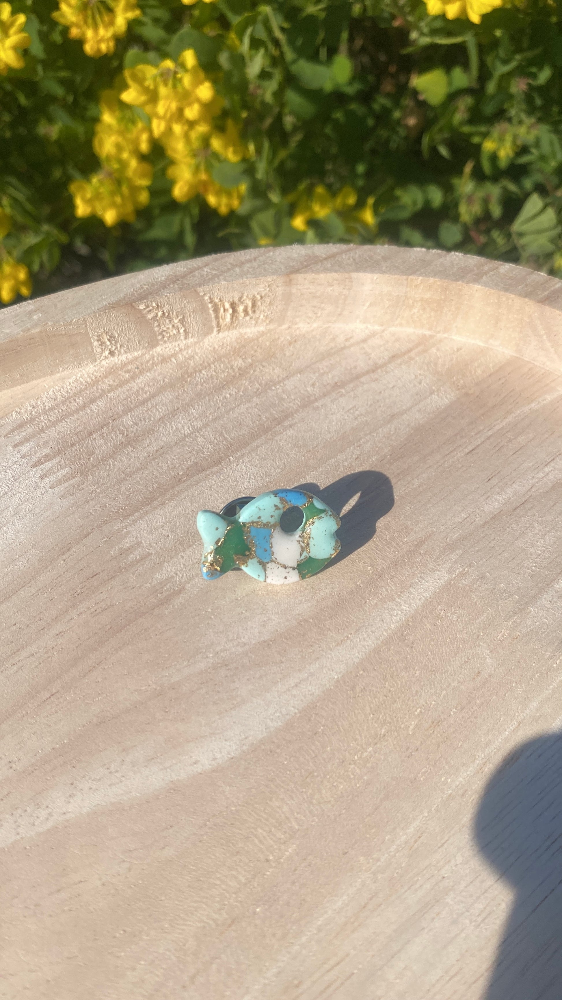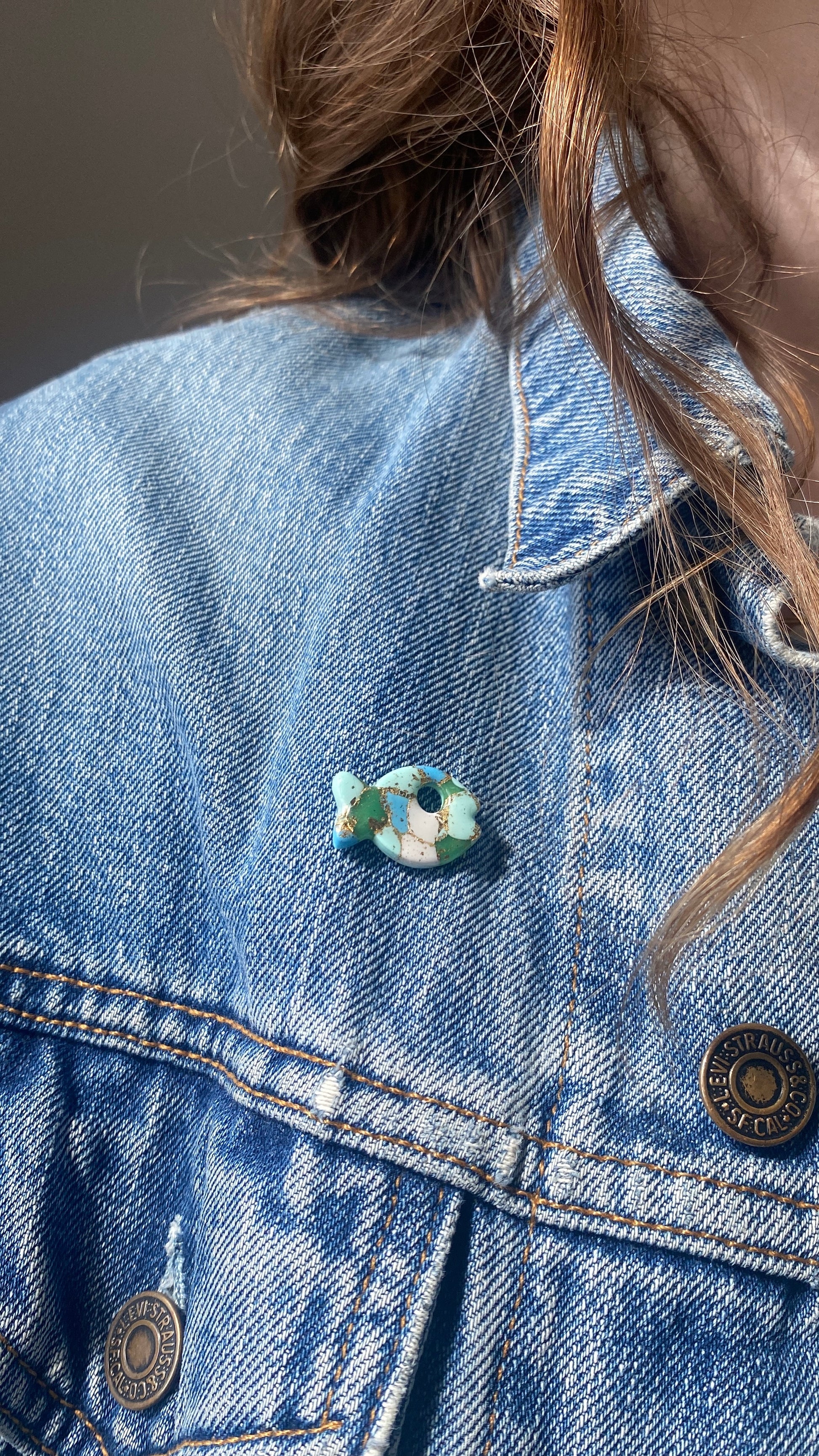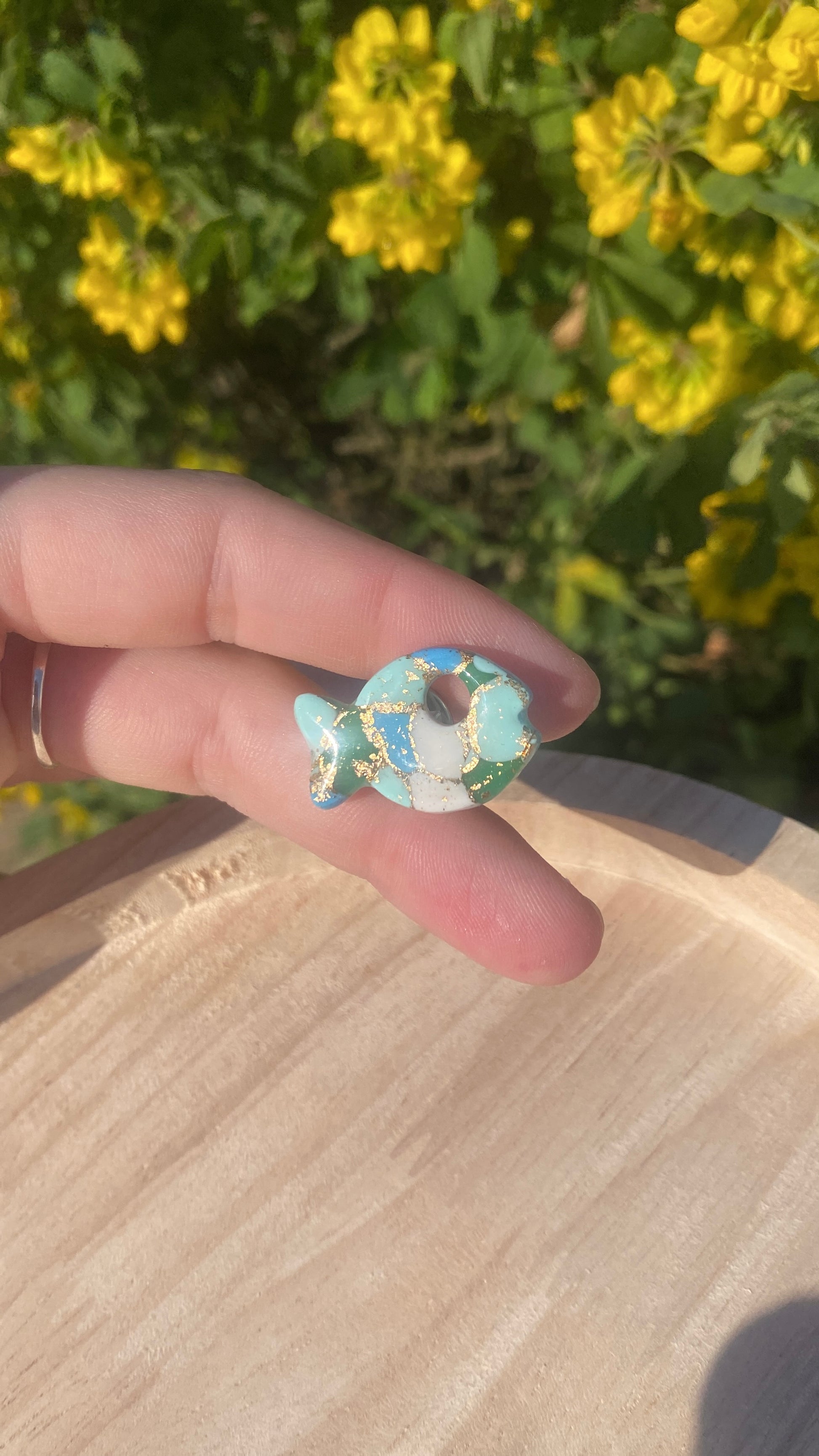 Pin’s poisson dans les tons de bleus/verts/dorés. Réalisé à la main en pâte polymère, et protégé avec de la résine.