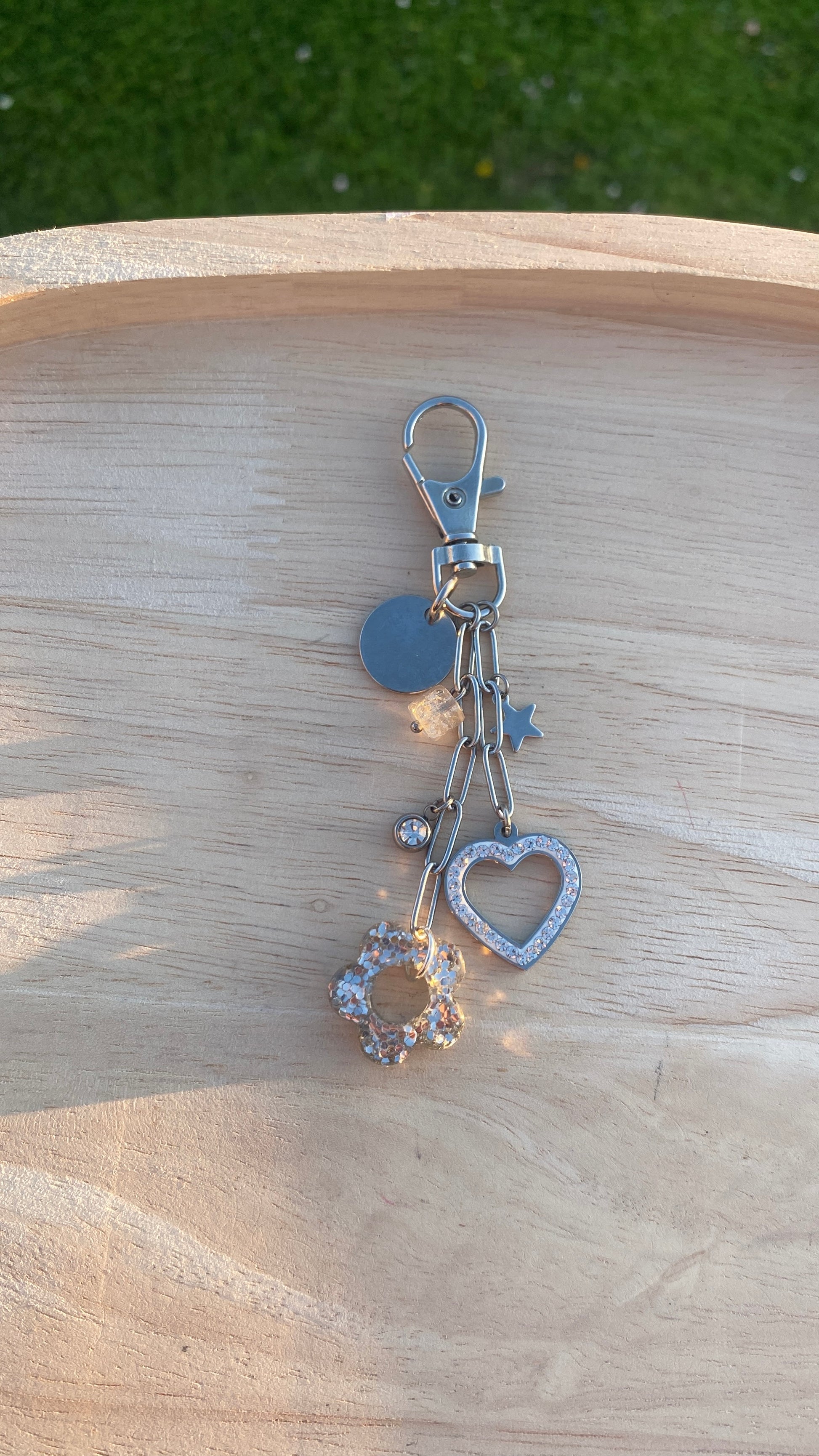 Porte-clefs/ bijou de sac argenté, avec breloques : fleurs à paillettes, cœur strass, étoile, perle.