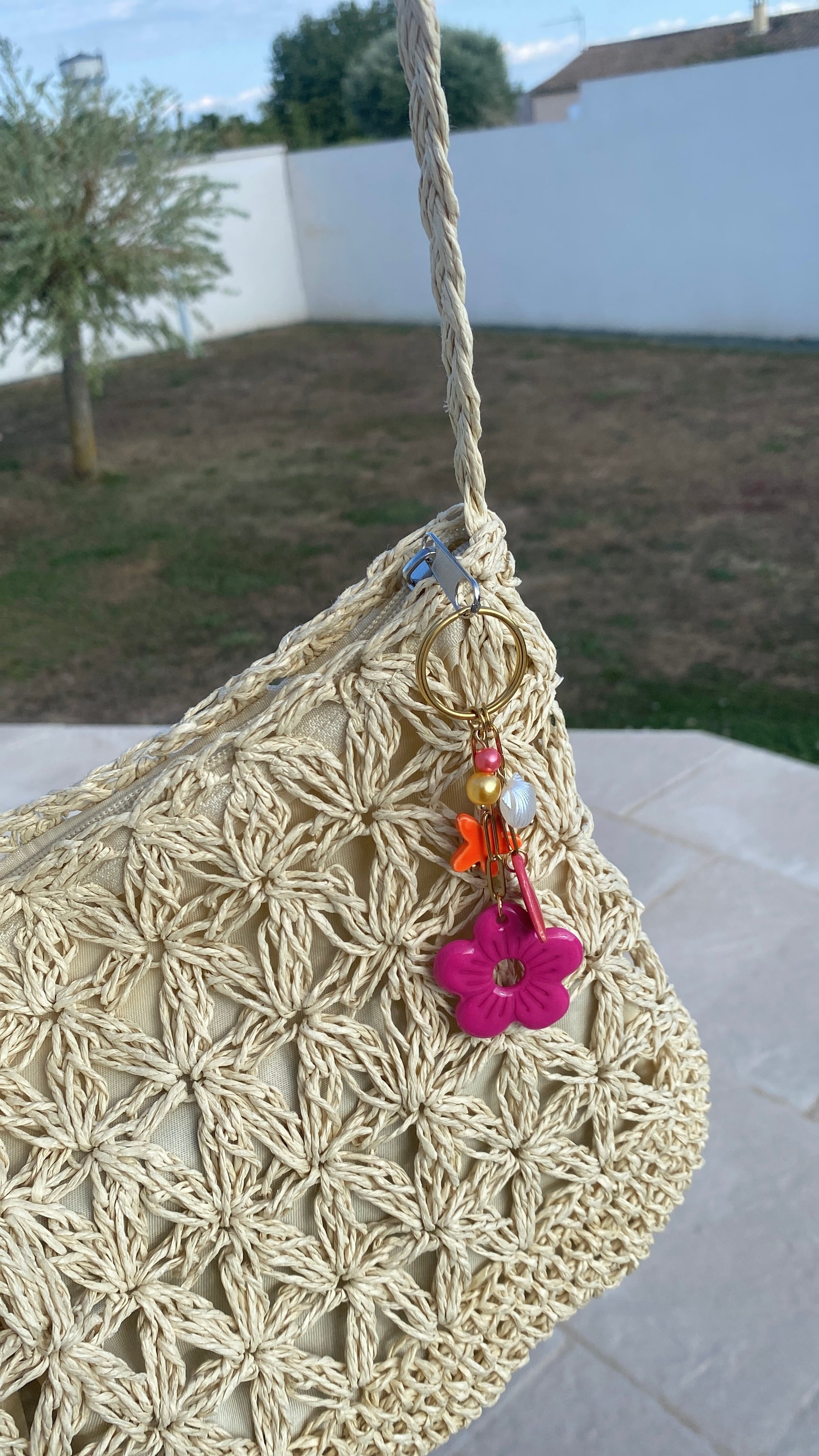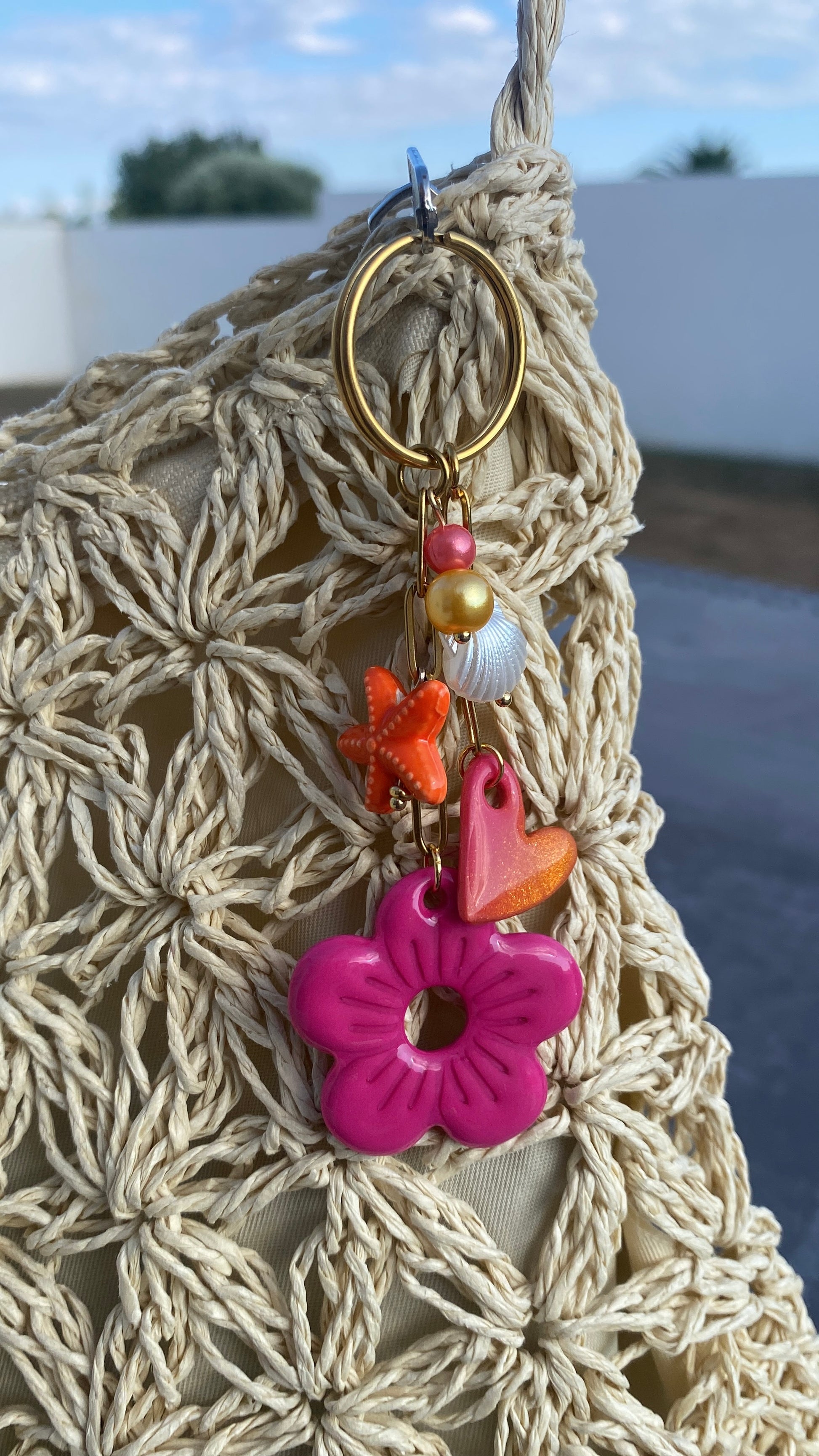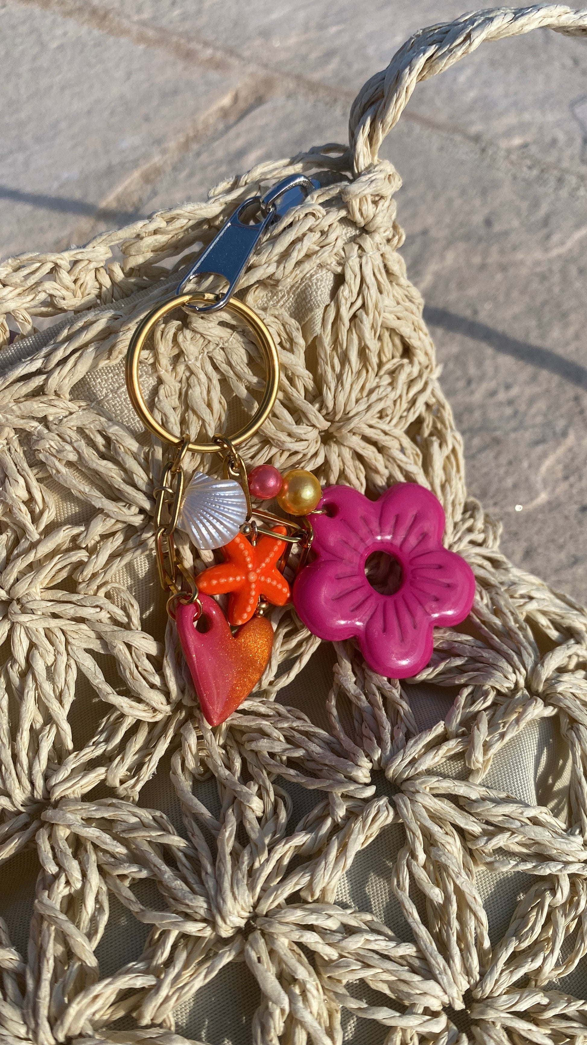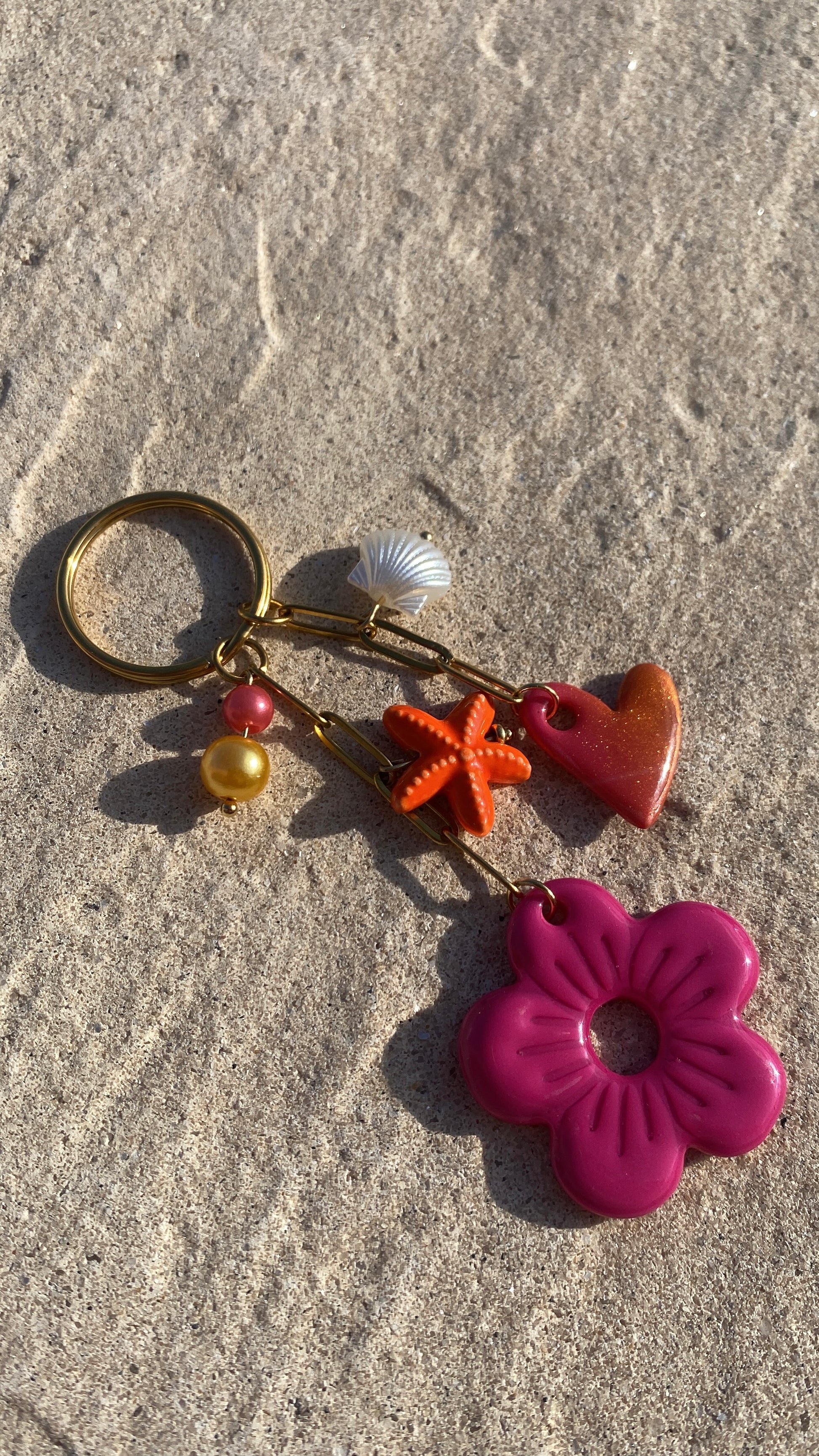 Porte clefs/ bijou de sac sunset : doré en acier inoxydable : fleur, coeur, Etoile de mer, coquillage, perles