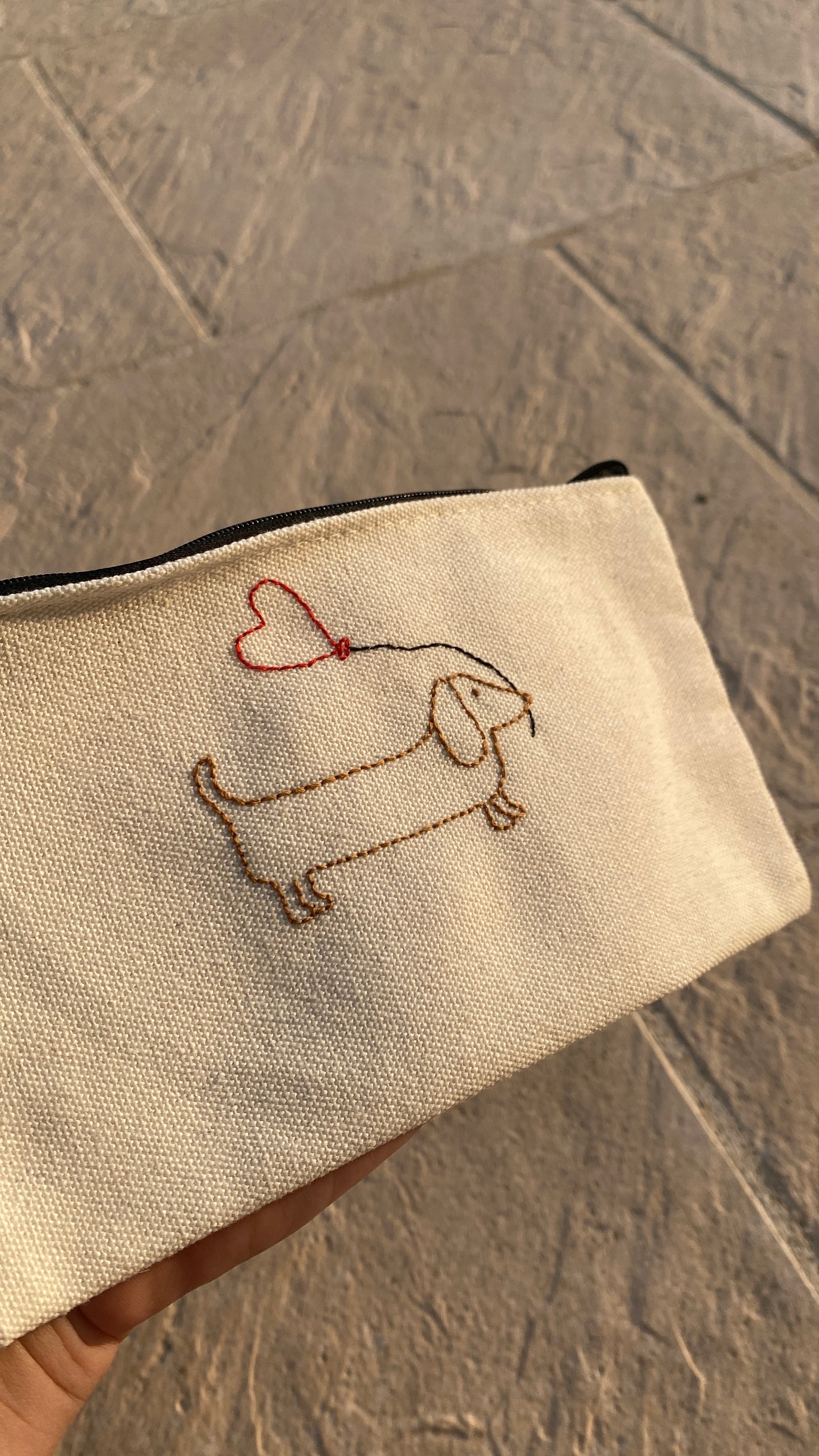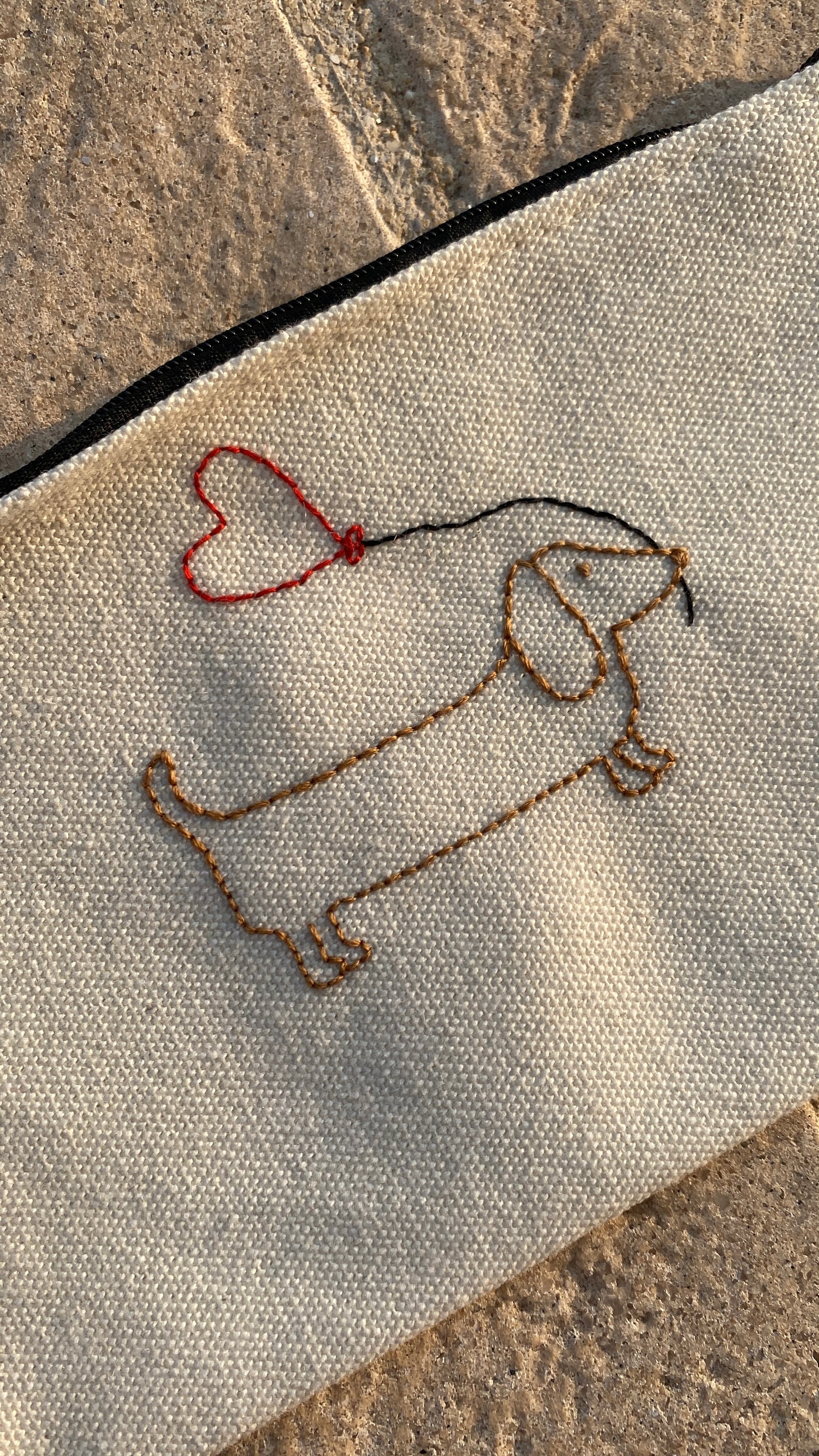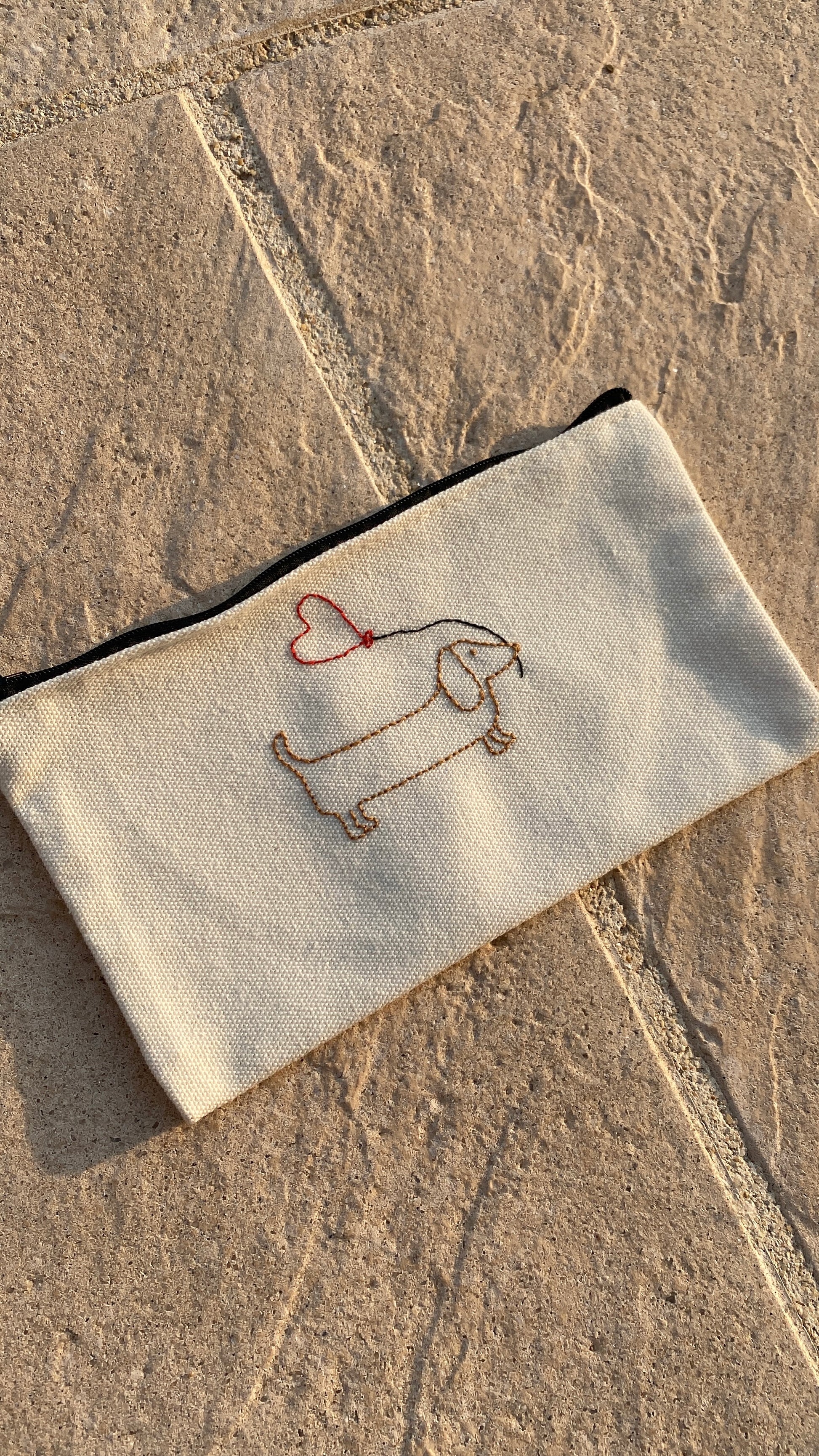 Trousse brodée teckel qui tient un ballon en forme de cœur.